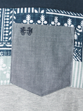 2トーン配色のボディに地中海をイメージしたバンダナ柄のプリント生地を切り替え、ダンガリーをアクセントにしたポケットTシャツです。
