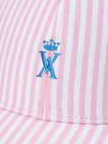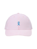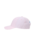 ピンクのストライプがキュートなブランドロゴキャップ。フロントにはロゴが、背面にはブランドネームがコントラストの効いた配色で配置されていて印象的です。