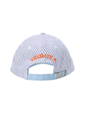 ストライプがミックスされたブランドロゴキャップ。フロントにはロゴが、背面にはブランドネームがコントラストの効いた配色で配置されていて印象的です。