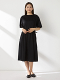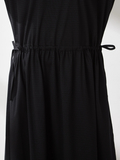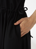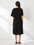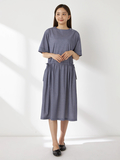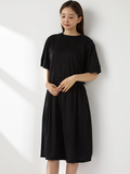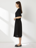 ゆったりとした涼し気なシルエットで着用出来るほか、ウエスト両脇のリボンでブラウジングさせたシルエットが楽しめるワンピースです。
