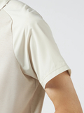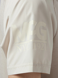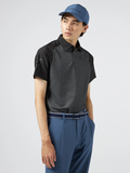 ボディはカットソーでフィット感重視、袖は同系色の布帛使い。同色のプリントでカッコよさを追求した一枚。