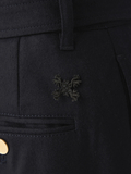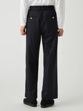 ■FABRIC梳毛糸を使用したサキソニー素材。梳毛を使用しているので、表面のなめらかな風合いと綺麗な光沢が美しい素材です。■MODELウエストに同生地で作成したリングベルト付きのワイドパンツ。素材の落ち感が感じられる美しいドレープの出るシルエットです。合わせるシューズを選ばない、汎用性の高いパンツです。