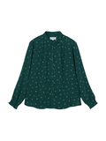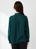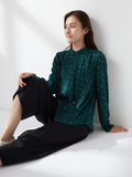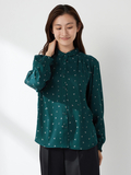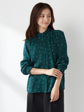 小さめで柔らかな雰囲気の襟がポイントの前空きブラウスです。袖口はシャーリングで伸びが良いデザインなので、カーディガンやジャケットが羽織りやすくなっています。袖をまくりやすく、まだ暑い時期の一枚着としても便利です。