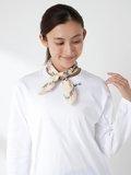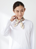 柔らかな手書き風のローズモチーフが女性らしいスカーフです。オールシーズン使いやすいサイズで、シンプルなTシャツの襟元アクセントにぴったりです。バッグに巻いてもコーディネートを華やかにしてくれます。