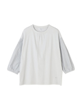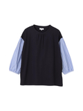 袖が布帛でピンタック使いのブラウスライクなプルオーバーです。襟元にはギャザーを入れて立体的に見せており、1枚で着ても様になります。