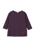 優しい印象のネックラインと、身頃の切替ですっきりと見えるシルエットの1枚カットソーです。襟のスリットや閂がさりげないアクセントです。カジュアル過ぎない3本線ボーダーと落ち着いたカラーで、大人カジュアルなアイテムです。