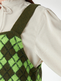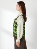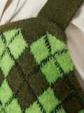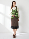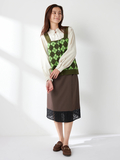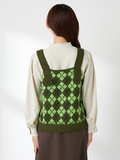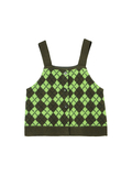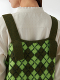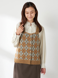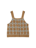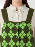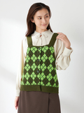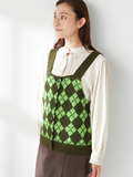 トラッドムードのアーガイル柄ニットベストです。アクセサリー感覚でお召いただける、肩ひもスタイルの軽いデザインです。フロントボタン仕様は、下の方を開けて、Aライン風にアレンジ可能です。
