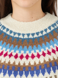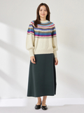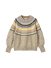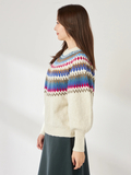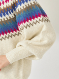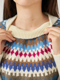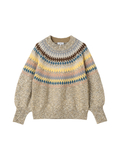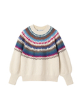 アームホールをゆったりと作り、今年らしいボリュームを取り入れたニットデザインです。アイキャッチのある配色柄がポイントです。