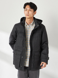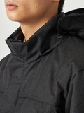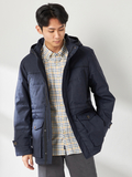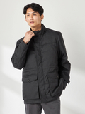 メランジ調の素材で大人の都会的なスタンドカラーダウンコートです。フード端、胸ポケット口の異素材使いや胸、ヨーク袖切り替えに配したパイピングが見た目のアクセントになっています。